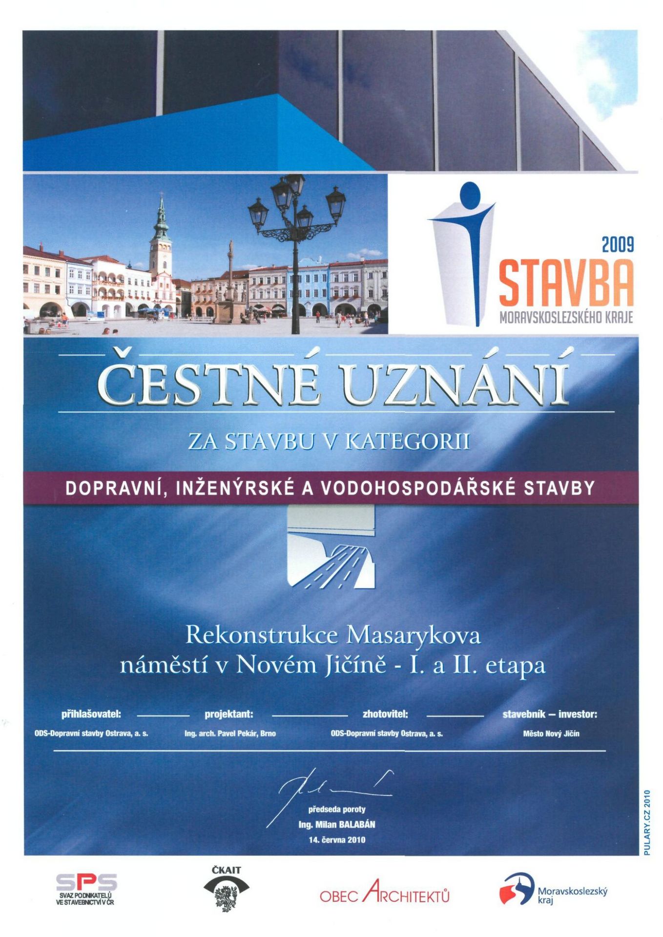 Čestné uznání v soutěži Stavba Moravskoslezského kraje za rok 2009 - Rekonstrukce Masarykova náměstí v Novém Jičíně - I. a II. etapa