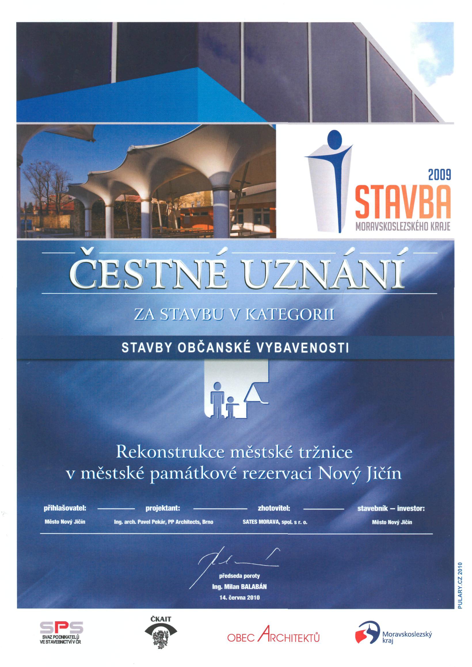 Čestné uznání v soutěži Stavba Moravskoslezského kraje za rok 2009 - Rekonstrukce městské tržnice v městské památkové rezervaci Nový Jičín