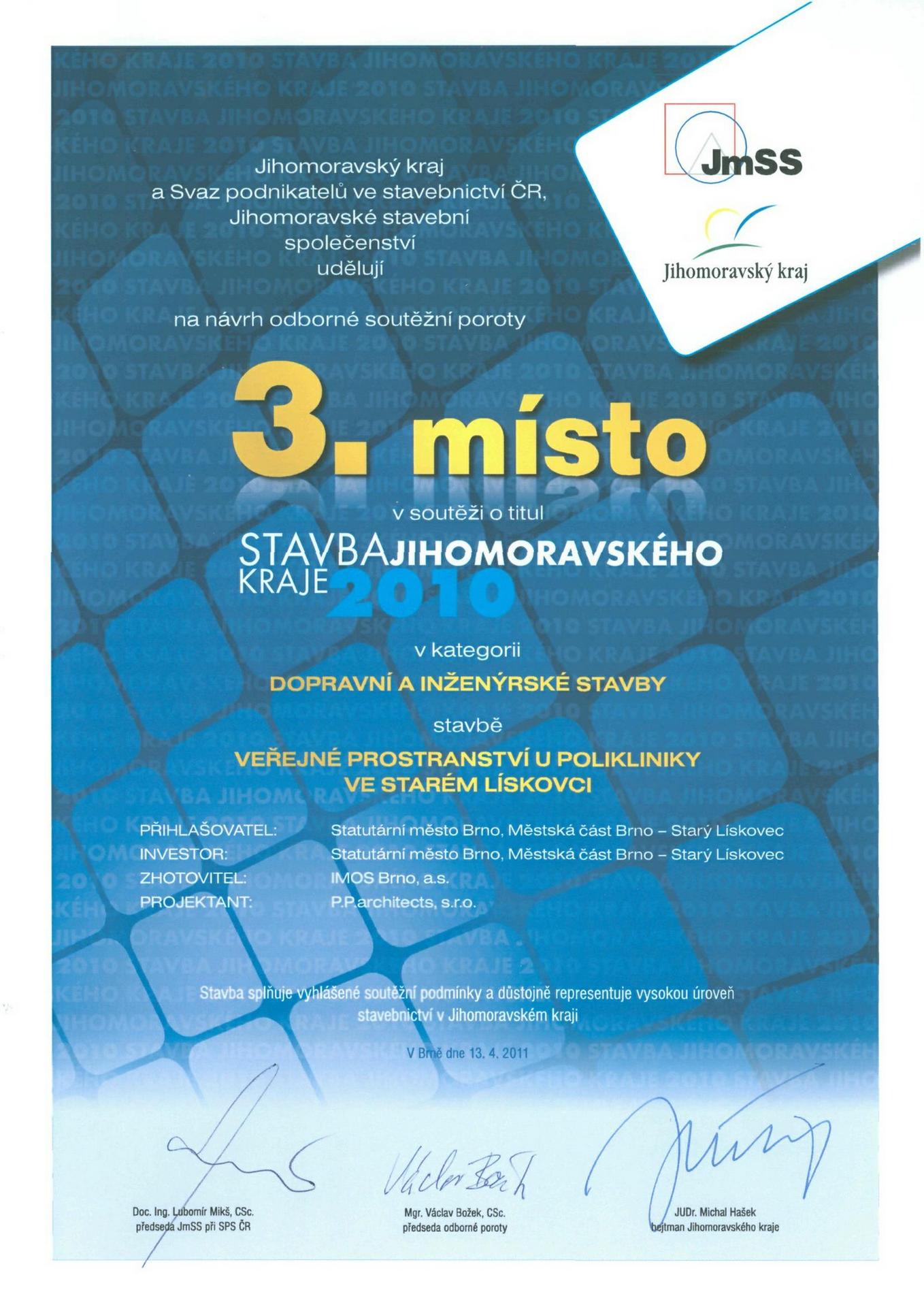 3. místo v soutěži Stavba Jihomoravského kraje za rok 2010 - veřejné prostranství u polikliniky ve Starém Lískovci