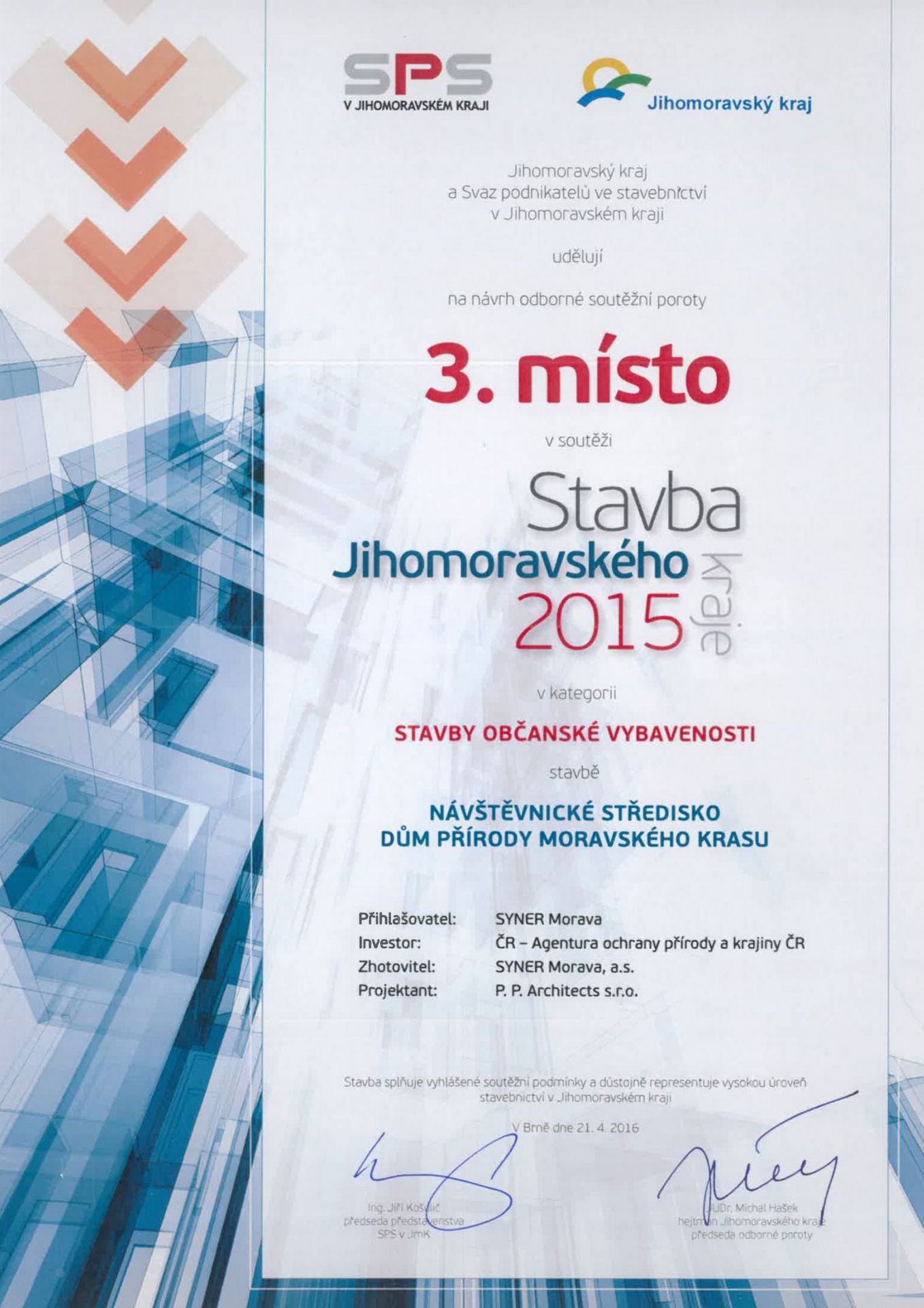 3. místo v soutěži Stavba Jihomoravského kraje za rok 2015 - návštěvnické středisko dům přírody Moravského krasu