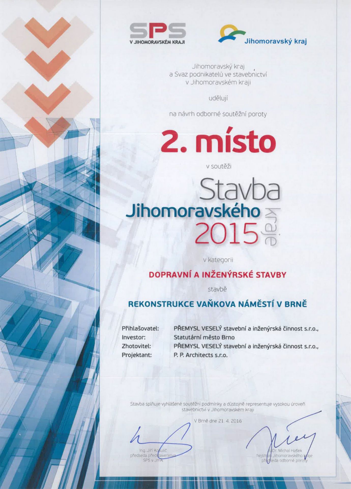 2. místo v soutěži Stavba Jihomoravského kraje za rok 2015 - rekonstrukce Vaňkova náměstí v Brně