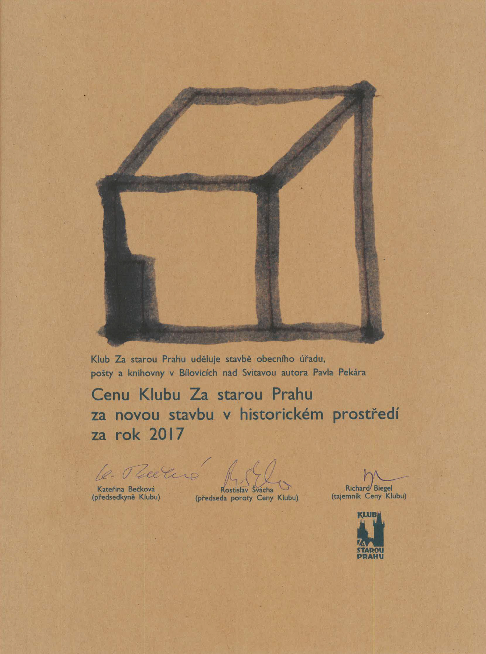 Zvláštní cena v soutěži Stavba Jihomoravského kraje za rok 2016 - revitalizace středu obce Bílovice nad Svitavou, obecní úřad, knihovna, pošta, obřadní síň, náměstí