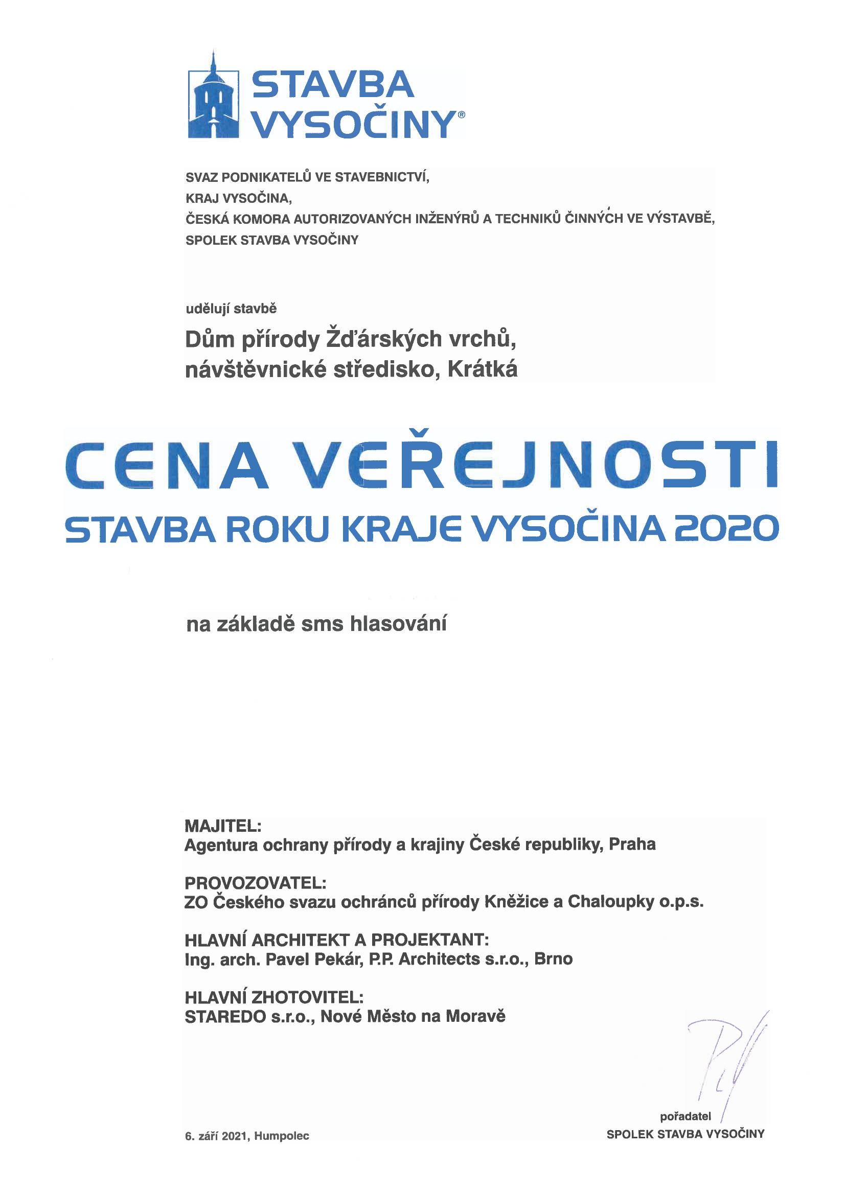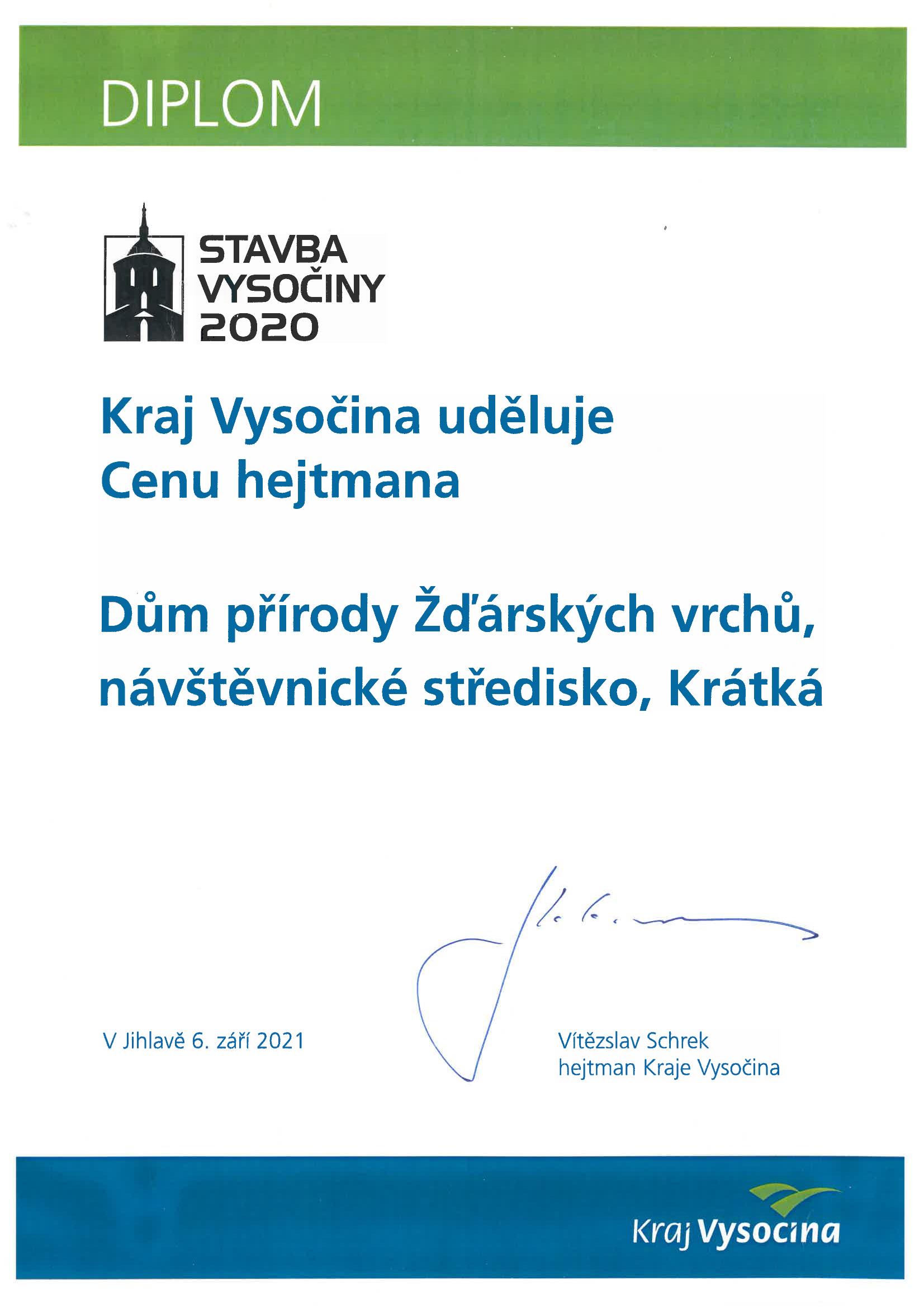 Cena hejtmana Kraje Vysočina za rok 2020 - Dům přírody Žďárských vrchů, návštěvnické středisko, Krátká